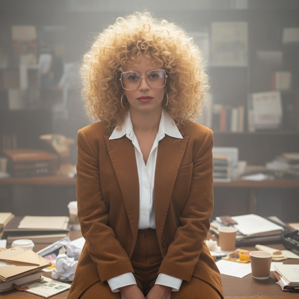 She handles life’s small disasters with the calm of an 80s protagonist who always knows more than she’s saying.